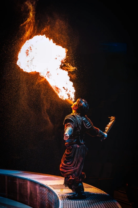 “本次升級,我們采用“天幕地屏+激光投影”的立體舞臺設(shè)計,打破了傳統(tǒng)演出的空間限制,給觀眾帶來前所未有的沉浸式體驗?!睂?dǎo)演閔銳接受采訪時說,“《王的戰(zhàn)車》以北方部落的古老傳說為藍(lán)本,將傳統(tǒng)技藝與現(xiàn)代科技巧妙融合。比如縵吊演員的表演象征著部落信仰的升華,而噴火表演則象征著勇士的熾熱斗志。整場演出既保留了傳統(tǒng)雜技的力量與驚險,又通過全息投影技術(shù)等科技手段賦予其全新的藝術(shù)表達(dá),希望觀眾在觀演的過程中,除了感受到震撼,也能體會到中國傳統(tǒng)文化的深厚底蘊(yùn)與傳承。